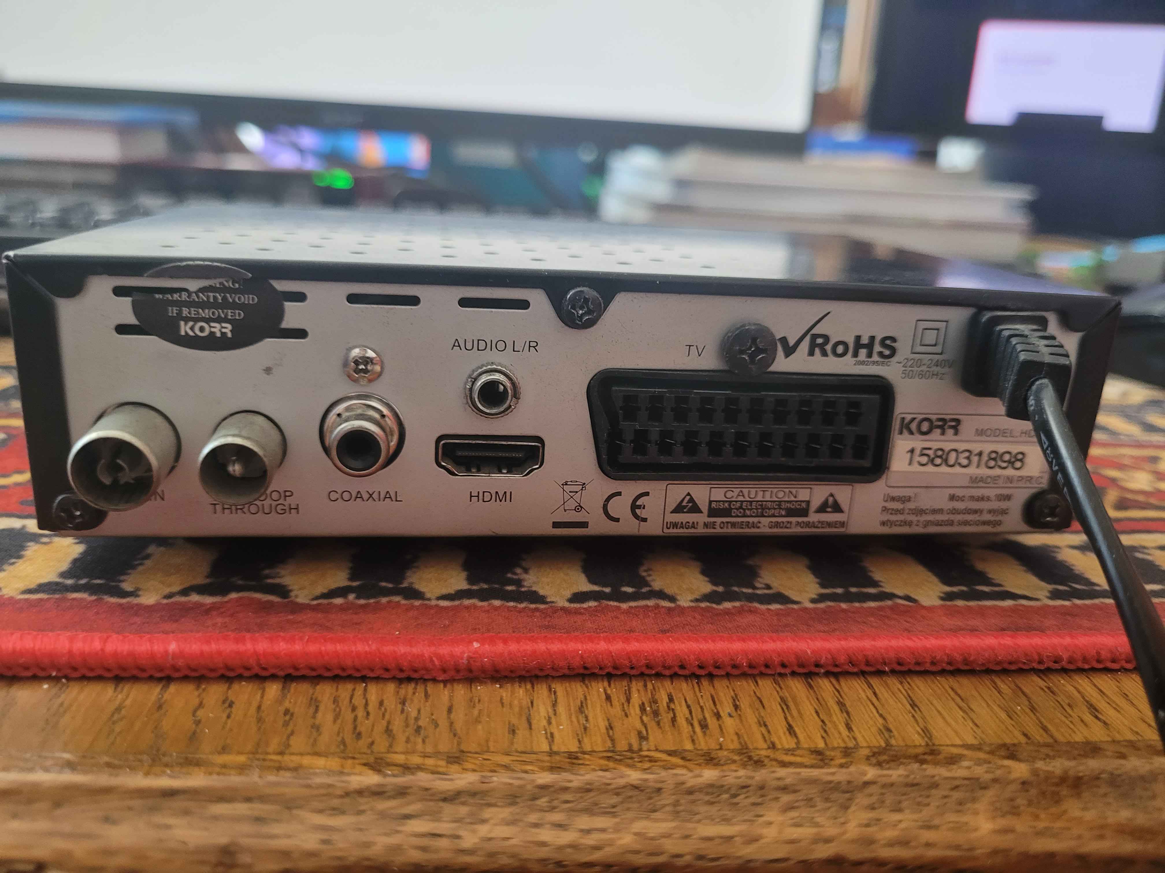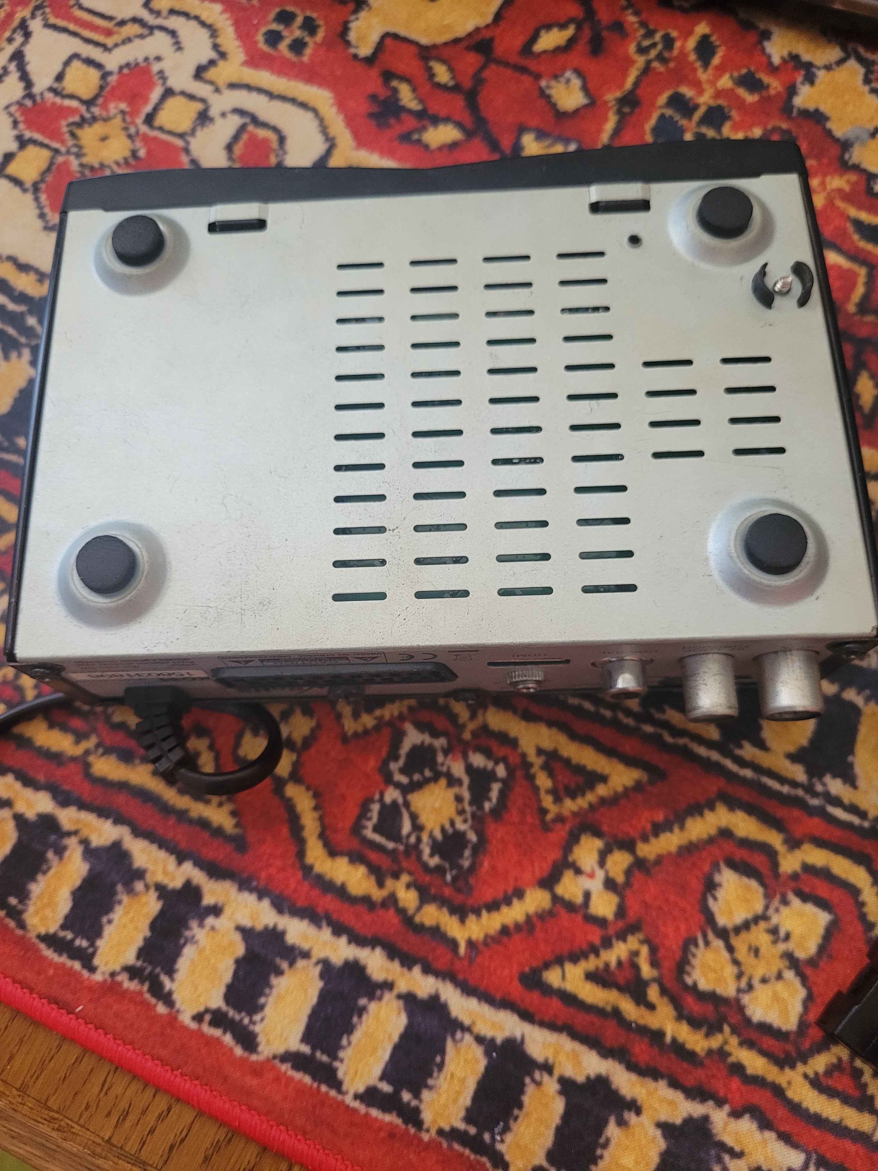 Dekoder DVB-T (MPEG-4/AVC, Full HD 1080p) Wejście: antenowe RF (koaksjalne) Wyjścia: HDMI, SCART, audio stereo cinch, coaxial SPDIF USB (PVR – nagrywanie + odtwarzanie multimediów) Zasilanie: 220–240 V, max 10 W. To stary, prosty tuner naziemnej telewizji cyfrowej. BEZ PILOTA.